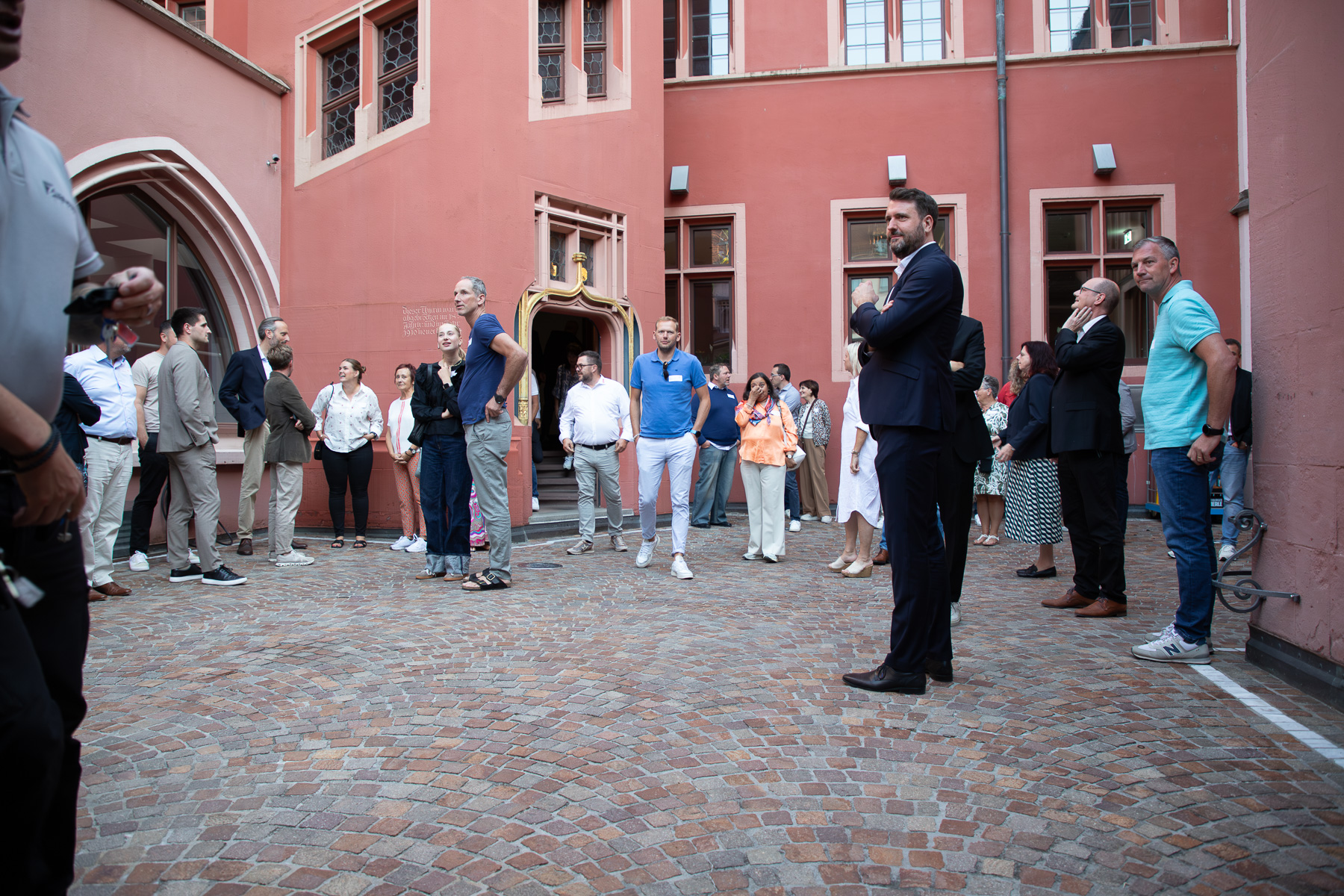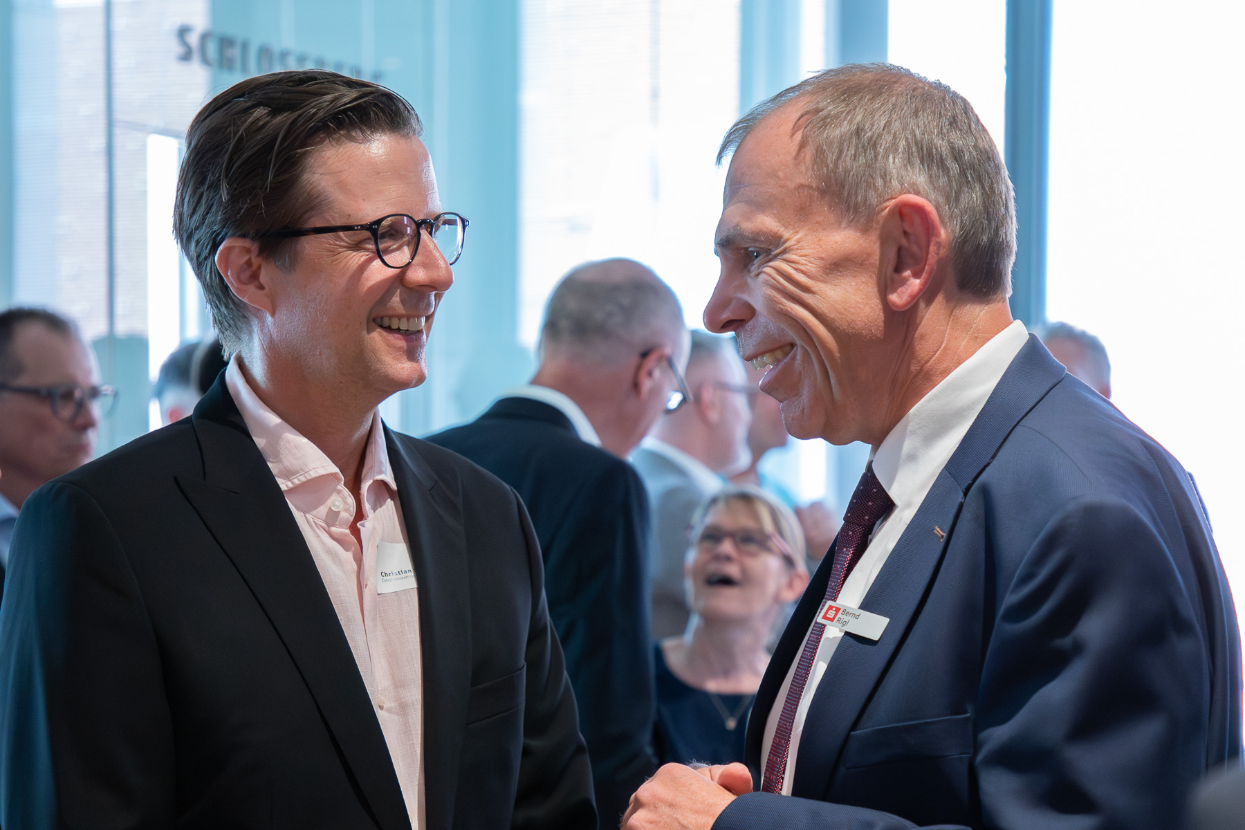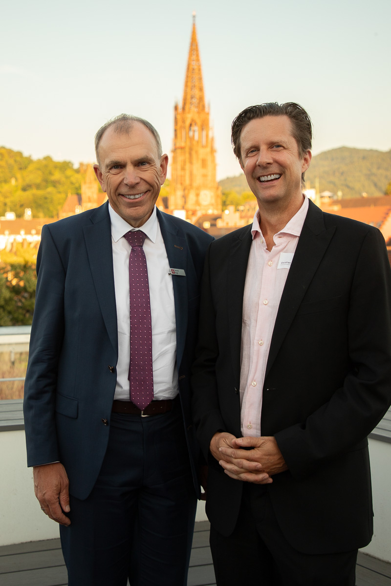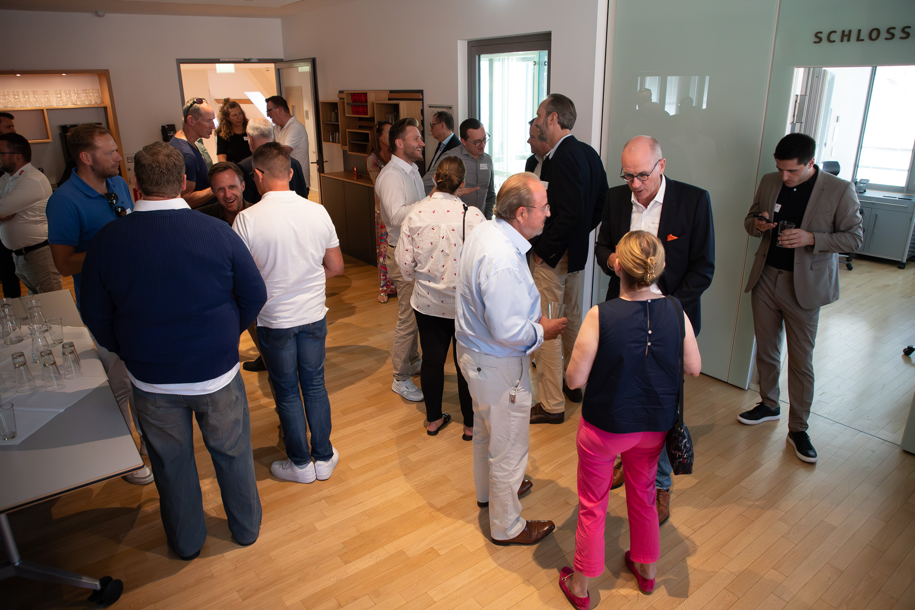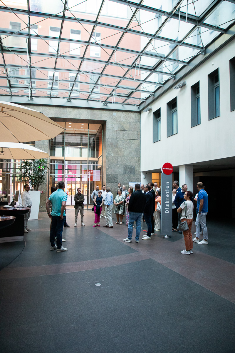 Nach einer kurzweiligen und sehr interessanten Führung durch die neue Vorstandsetage und weitere historisch bemerkenswerte Bereiche im denkmalgeschützten Bereich des eindrucksvollen Gebäudes wechselten wir auf die unvergessliche Dachterrasse mit Münsterblick. Der Abend klang bei köstlichen kleinen Leckereien und erlesenen regionalen Getränken aus, begleitet von anregenden Gesprächen und einem vielfältigen Austausch.