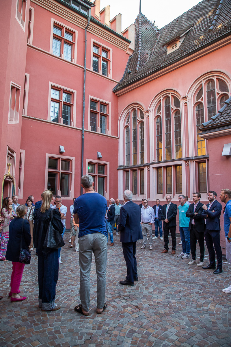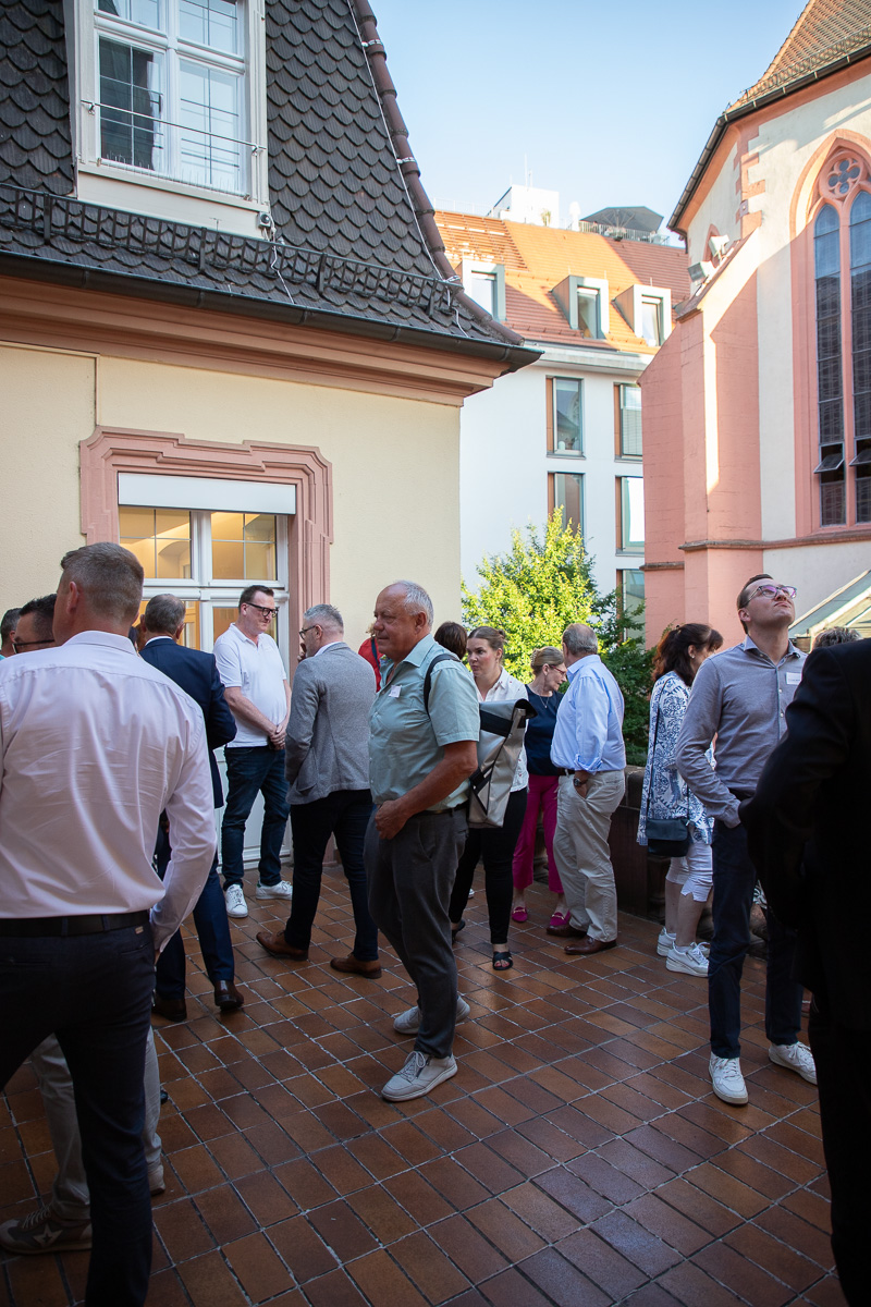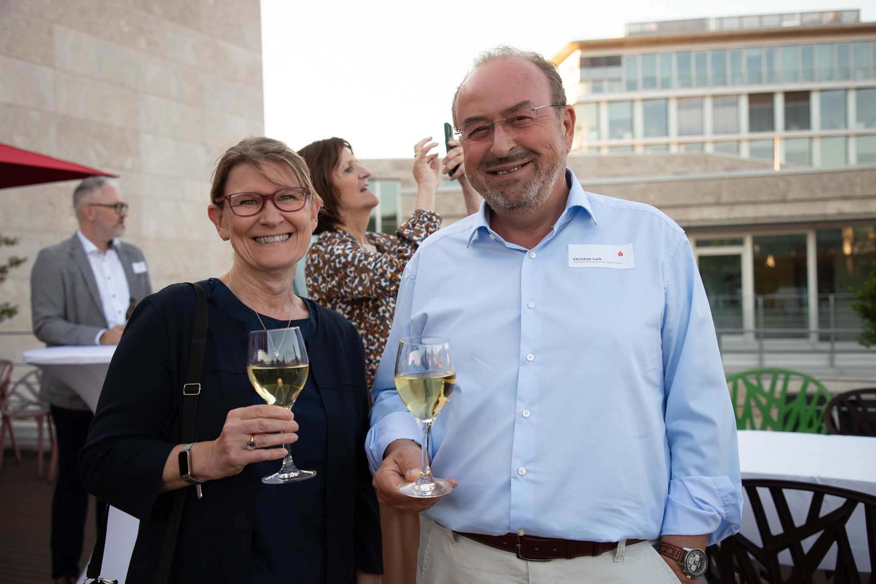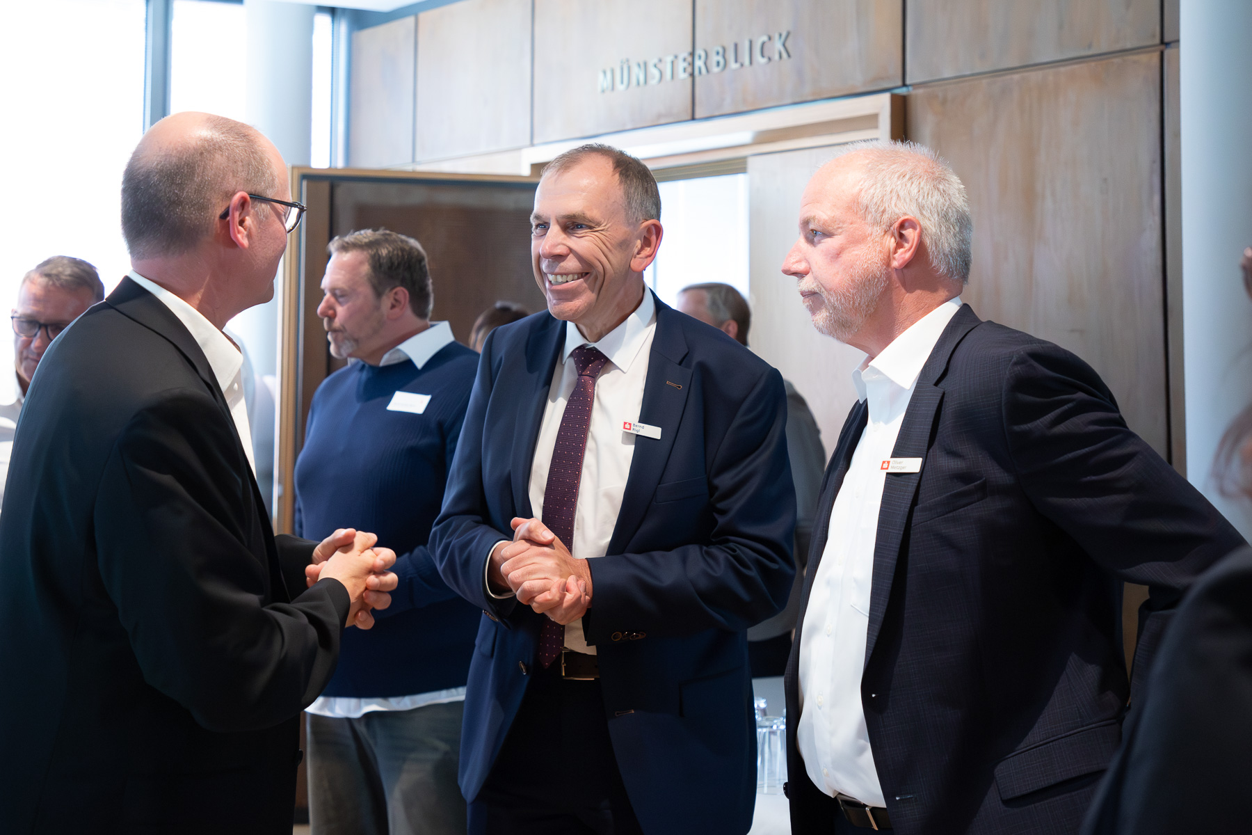 Nach einer kurzweiligen und sehr interessanten Führung durch die neue Vorstandsetage und weitere historisch bemerkenswerte Bereiche im denkmalgeschützten Bereich des eindrucksvollen Gebäudes wechselten wir auf die unvergessliche Dachterrasse mit Münsterblick. Der Abend klang bei köstlichen kleinen Leckereien und erlesenen regionalen Getränken aus, begleitet von anregenden Gesprächen und einem vielfältigen Austausch.