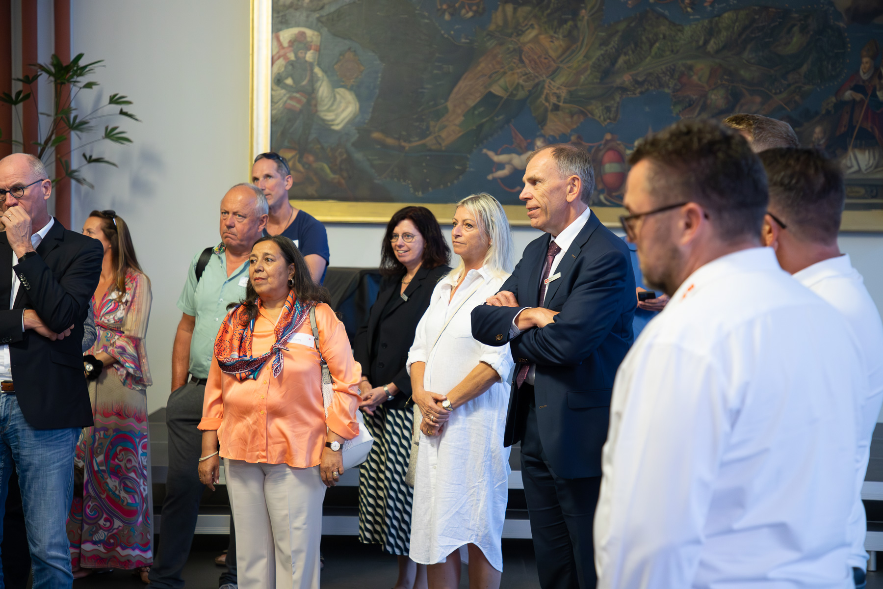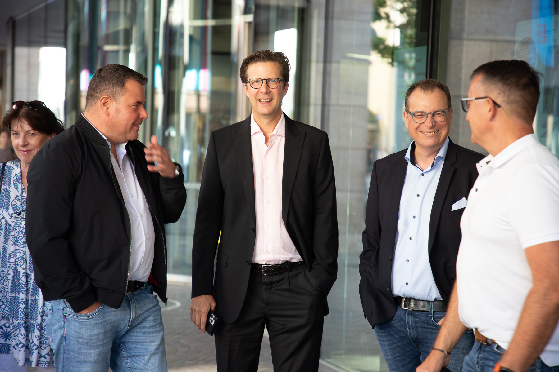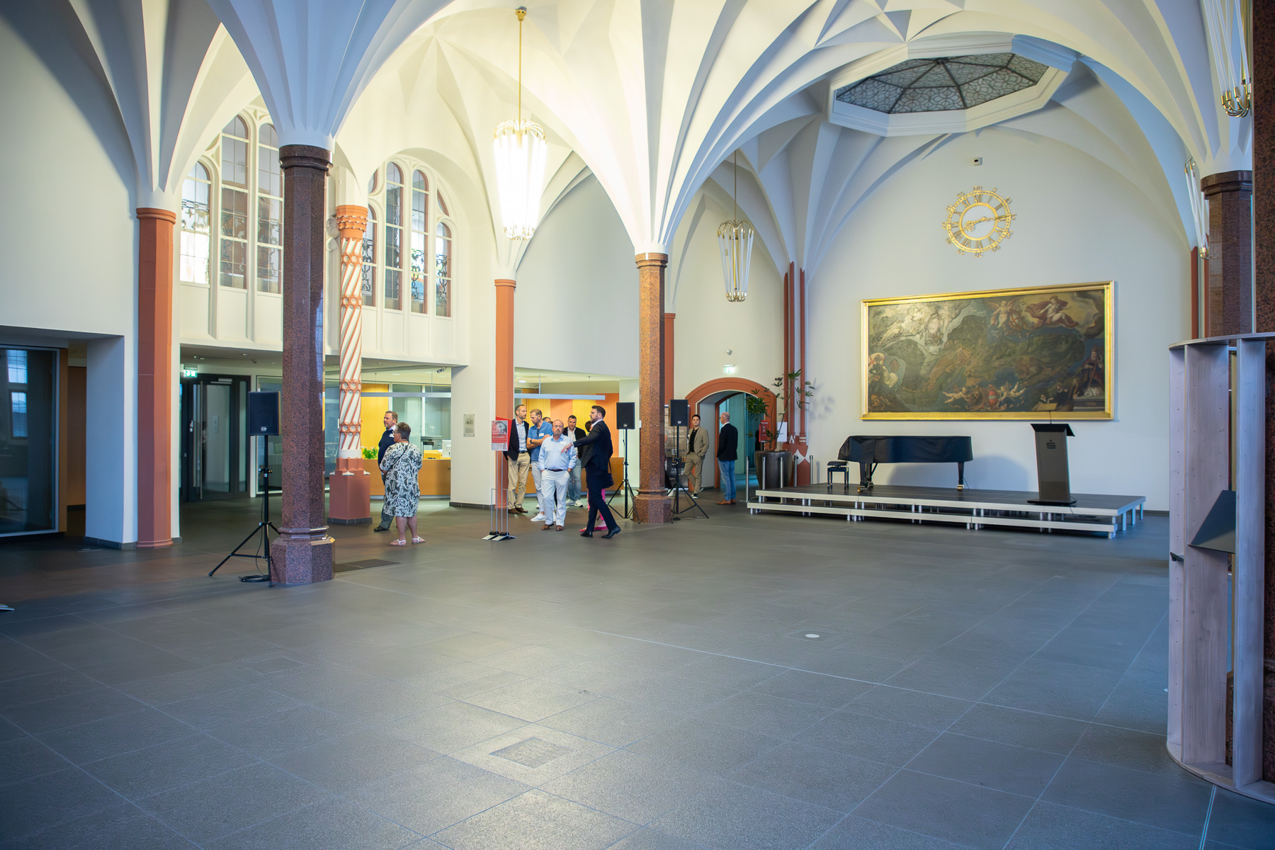 Nach einer kurzweiligen und sehr interessanten Führung durch die neue Vorstandsetage und weitere historisch bemerkenswerte Bereiche im denkmalgeschützten Bereich des eindrucksvollen Gebäudes wechselten wir auf die unvergessliche Dachterrasse mit Münsterblick. Der Abend klang bei köstlichen kleinen Leckereien und erlesenen regionalen Getränken aus, begleitet von anregenden Gesprächen und einem vielfältigen Austausch.