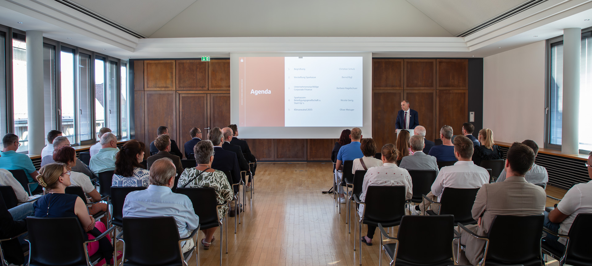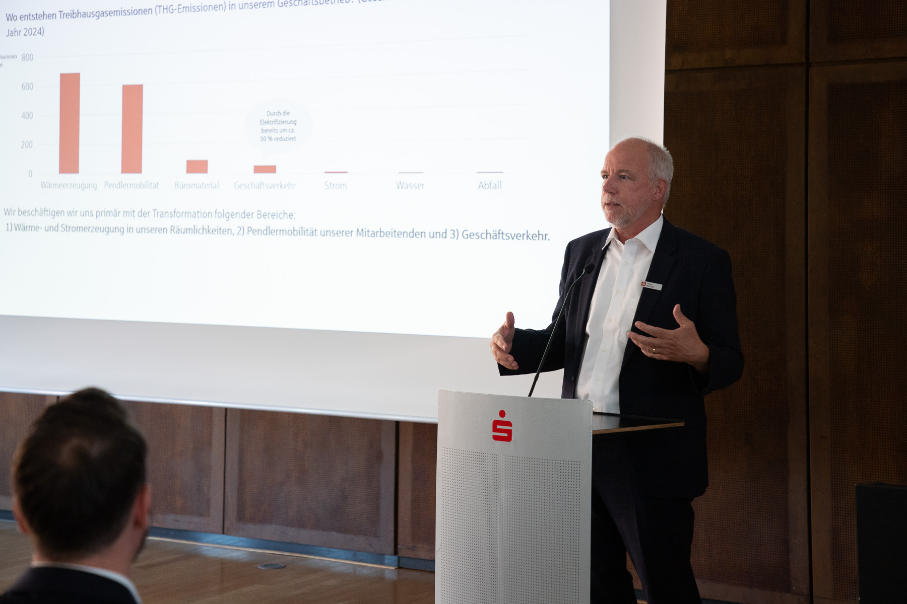 Zur Abrundung der Kurzvorträge erläuterte Oliver Metzger, Abteilungsleitung Verwaltungs- und Baumanagement, das Ziel der Sparkasse, bis 2035 treibhausgasneutral zu werden.